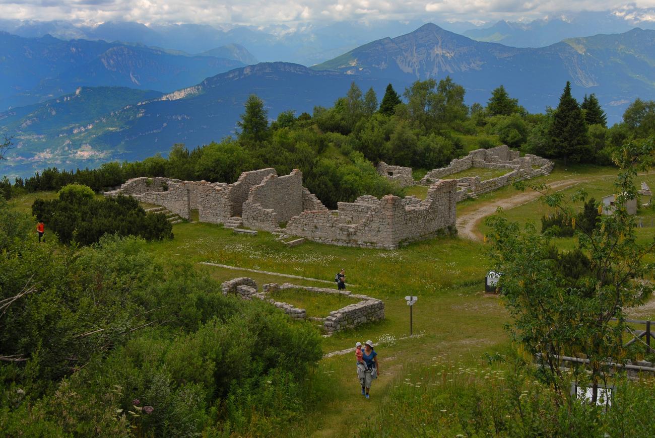 Viene in mente la profezia dell'ultimo film del compianto Ermanno Olmi “Torneranno i prati” quando ci si inoltra con lo zaino fra quelle che un tempo erano le baracche dei militari impegnati sul confine italiano. Ora sono tornati i fiori e lo sguardo può guardare liberamente lontano verso orizzonti di pace, senza incrociare le altre postazioni (come il Corno Battisti, in Vallarsa, foto sotto) collegate in linea d'aria.