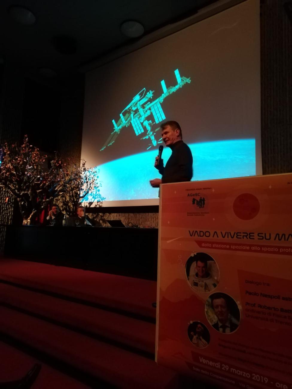 Il filmato è stato mostrato alla fine dell'incontro "Vado a vivere su Marte? Dalla stazione spaziale allo spazio profondo" promosso dall'Agesc (Associazione Genitori Scuole Cattoliche) venerdì 29 marzo in una sala della Cooperazione affollata di studenti