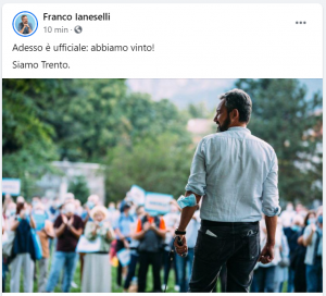 A 85 sezioni scrutinate su 98 infatti la coalizione SiAmo Trento ottiene il 54,22%, rispetto al 30,52% della coalizione di centrodestra, ed è lo stesso Ianeselli ad annunciare la vittoria con un post sui social: “Adesso è ufficiale: abbiamo vinto!”.