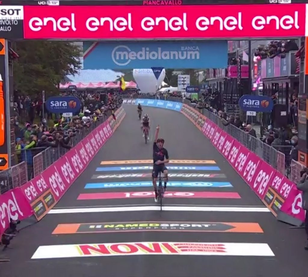 Il Giro d’Italia, oggi, parte proprio dal nido di questi uccelli acrobatici. La quindicesima tappa, abbandonata la base aerea di Rivolto, prevede circa 3500 metri di dislivello distribuiti tra tre gran premi della montagna e un arrivo spettacolare a Piancavallo. La fuga di giornata vede un grande Rohan Denis che stacca tutti i figgitivi sulla Forcella di Pala Barzana andandosene in solitaria. È però sulla salita di Piancavallo che si accende la sfida tra i grandi di classifica. Il gruppo maglia rosa recupera i fuggitivi di giornata lungo l’ascesa finale. Il ritmo del Team Sunweb di Wilco Kelderman riduce completamente il distacco con Denis. La velocità impressionante sulla salita a Piancavallo mette in difficoltà Jacob Fuglsang, Pello Bilbao e Pozzovivo. Il vero colpo di scena avviene a 8,6 chilometri: Nibali scoppia e si stacca sensibilmente! A 7 km Geoghegan Hart Kelderman e Hindley imprimono un’ulteriore accelerazione e staccano di qualche metro la maglia rosa. I secondi però scorrono impietosi e Almeida soffre tantissimo. L’assalto di Kelderman prende il volo proprio nell’ultimo chilometro. Nella volata finale a tagliare il traguardo è ancora una volta un corridore della Ineos Granadier, Geoghegan Hart, che conquista anche il terzo posto in classifica generale!