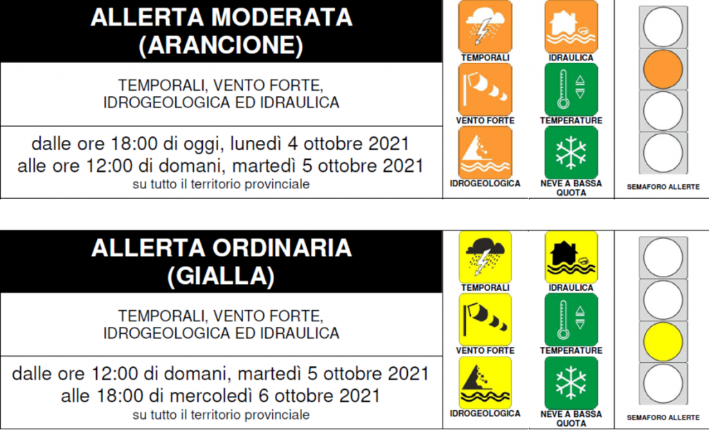 La Protezione civile ha emesso un avviso di allerta valido per tutto il territorio provinciale: sarà “moderata (arancione)” dalle ore 18:00 di oggi, lunedì 4 ottobre 2021, alle ore 12:00 di domani, martedì 5 ottobre 2021; diventerà “ordinaria (gialla)” dalle ore 12:00 di domani, martedì 5 ottobre 2021 alle 18:00 di mercoledì 6 ottobre 2021.