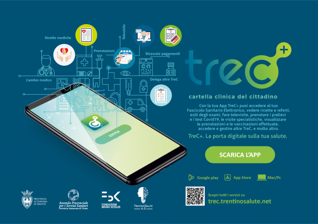 A partire da oggi, lunedì 15 novembre, è a disposizione gratuitamente di tutti gli iscritti al sistema sanitario provinciale la nuova piattaforma TreC+, sviluppata grazie al contributo di medici e cittadini. TreC+ è frutto di un progetto voluto dal Centro di competenza TrentinoSalute4.0, che ha messo in campo professionalità e organizzazioni dei tre enti, PAT, APSS e FBK. Grazie a TreC+, evoluzione della già ben nota TreC (Cartella Clinica del Cittadino), oggi il Servizio sanitario provinciale può vantare una delle prime piattaforme di servizi online in Italia che accompagna i cittadini dalla nascita alla vecchiaia lungo tutto il percorso di vita, ridisegnando il rapporto cittadino-sanità in ottica digitale.