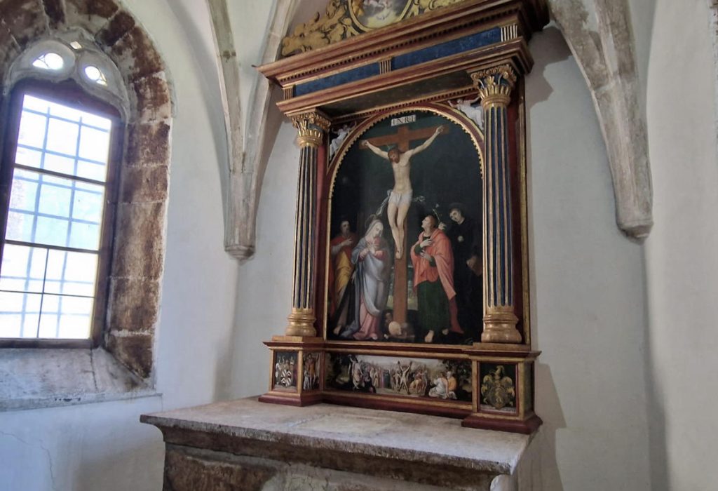 Realizzata presumibilmente nella seconda metà del XVI secolo, si presume in occasione del matrimonio tra il barone Fortunato Madruzzo (1534-1606) capitano dei castelli vescovili del principato trentino, e Margherita von Hohenems (1536-1592), la pala lignea raffigura la Crocifissione. Ai piedi della croce si trovano a sinistra la Madonna affiancata da Sant’Andrea, e a destra (si suppone) San Giovanni e San Bernardino da Siena. Nella parte centrale della predella, che costituisce il piano d’appoggio della pala, è raffigurata la scena del martirio di Sant’Andrea, mentre lateralmente si trovano un San Sebastiano e un San Rocco. Due colonne con rispettivi capitelli, infine, sorreggono un architrave neoclassico sormontato da una cimasa al centro della quale si trova un dipinto ovale raffigurante il Padre Eterno.