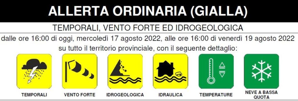 Passato Ferragosto, torna il maltempo sul Trentino: la Protezione civile infatti ha emesso oggi un avviso di allerta ordinaria (gialla), per temporali, vento forte e possibili problemi idrogeologici e idraulici, dalle 16 di mercoledì 17 agosto alle ore 16 di venerdì 19 agosto 2022 su tutto il territorio provinciale.