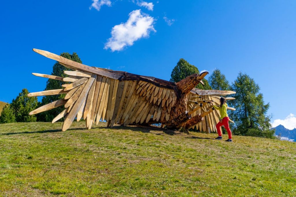 Un’aquila gigante in legno è l’ultima opera di Franz Avancini, artista trentino attivo da 20 anni e conosciuto per opere come la capra gigante in Bondone e il lupi della Val di Fassa. La scultura, ultimata pochi giorni fa, è stata realizzata sul Buffaure, un’area escursionistica raggiungibile da Pozza di Fassa in telecabina.