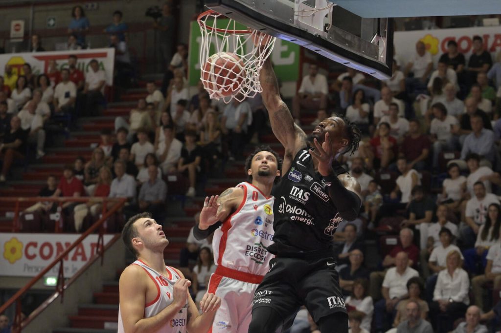 La cronaca del match. Udom è ai box a causa di un mal di schiena che sarà valutato domani. Dopo quasi due minuti sullo 0-0, è Grazulis a trovare dall’arco il primo canestro dal campo della partita: la tripla dell’ala lettone sblocca l’attacco bianconero, che in rapida successione trova due triple di Baldwin e buone iniziative di Biligha e Alviti (gran schiacciata a una mano per il 5-15). L’energia di Cooke e Conti dalla panchina prosegue il buon momento di Trento nonostante la fiammata di Wheatle e Ogbeide, così coach Brienza spende un timeout con la Dolomiti Energia avanti 10-21. Un pazzesco alley-oop sull’asse Hubb-Cooke e un bel canestro di Conti permettono agli ospiti di arrivare anche a +13 a inizio secondo quarto, ma poi il secondo parziale si trasforma in un incubo per Forray e compagni: Pistoia trascinata anche dal suo pubblico piazza un incredibile break di 21-2 che vale il primo vantaggio della partita a 3’ dall’intervallo lungo (35-29), l’Aquila nonostante le palle perse e qualche sbandata in difesa prova a rimettersi in carreggiata con un canestro di Hubb e un fallo in attacco subito da Grazulis. A metà partita in vantaggio però c’è ancora l’Estra (42-37). I bianconeri aprono il terzo quarto con le triple in sequenza di Grazulis, Forray e Alviti, il problema è che l’attacco dei padroni di casa se possibile fa ancora meglio e grazie allo show balistico di Moore e Willis i biancorossi restano avanti di 8 (56-48). Sono le iniziative di Baldwin e Hubb, insieme a un gran fallo e canestro di Stephens, a far tornare a contatto gli ospiti, che sorpassano con una tripla caparbia proprio di Prentiss: dopo 30’ il punteggio è in perfetta parità sul 62-62. È Cooke a prendere in mano l’attacco di Trento entrando negli ultimi 10’ di gioco: schiacciata e canestro da sotto, poi Baldwin a 5’30” dalla fine va fino in fondo e Brienza spende un timeout (67-70). Ogbeide riavvicina i suoi ma Baldwin e Alviti segnano due canestri pesantissimi e i bianconeri espugnano il caldissimo campo della neopromossa toscana.
