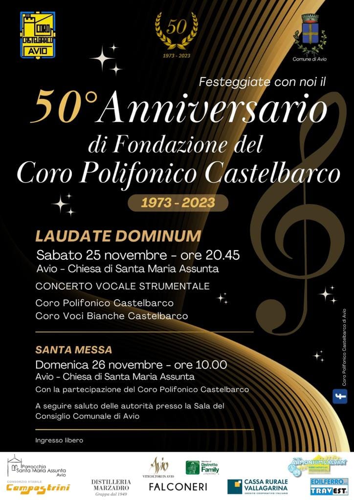 Il Coro Polifonico Castelbarco di Avio festeggerà il proprio 50° di fondazione con un concerto nella chiesa parrocchiale di S. Maria Assunta ad Avio sabato 25 novembre alle 20.45 e domenica 26 novembre cantando alla S. Messa delle 10.00 e con un momento commemorativo in municipio ad Avio.