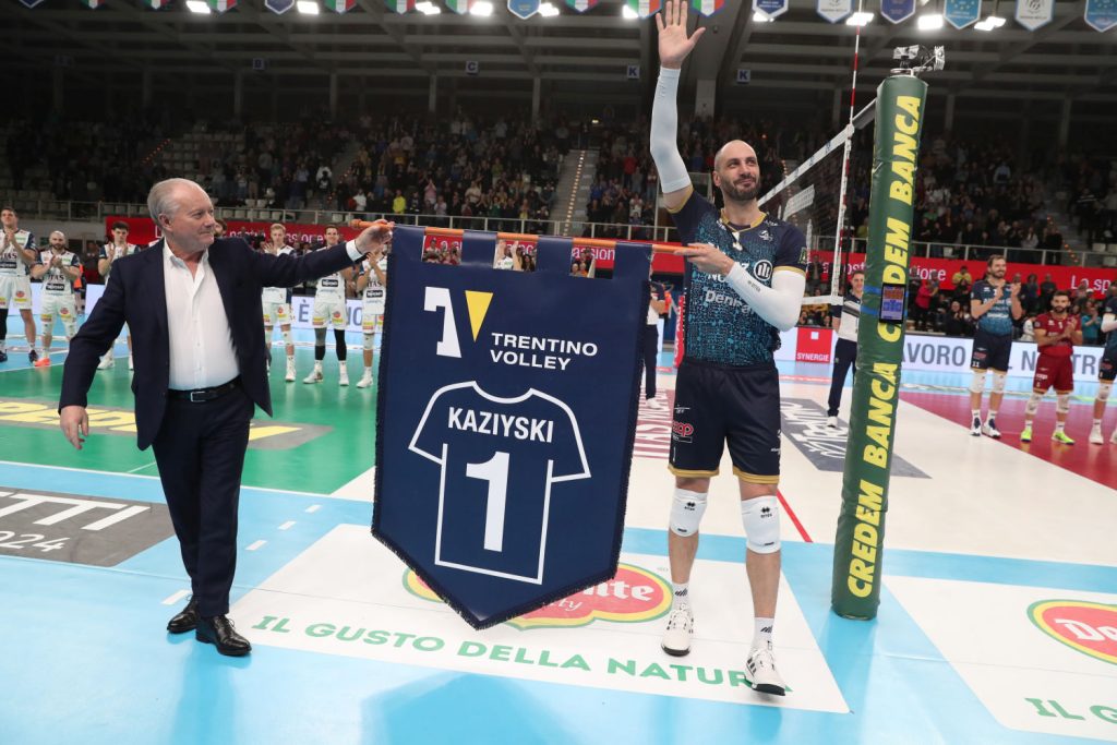 Prima del fischio d’inizio, tutto il palazzetto accoglie con una standing ovation il grande campione Matey Kaziyski, per anni bandiera dei gialloblù, con cui l’anno scorso ha vinto lo Scudetto da protagonista. E il presidente Bruno Da Re coglie l’occasione per omaggiare il numero uno, anche se ora si trova dalla parte opposta del campo, consegnandogli simbolicamente il gonfalone raffigurante la maglia numero 1 che il fuoriclasse bulgaro ha sempre indossato nelle sue 433 partite con la Trentino Volley, ufficialmente ritirata proprio oggi.