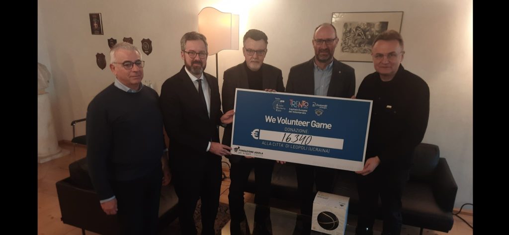 Prologo all’inaugurazione di Trento Capitale Europea del volontariato 2024, la “We volunteer game”, la partita basket di EuroCup di mercoledì scorso tra Dolomiti Energia Trentino e Buducnost Podgorica, è stata uno dei primi eventi di questo anno dedicato alla promozione e alla valorizzazione dell’attività dei volontari. L’ingresso alla T quotidiano Arena era a offerta libera e il ricavato delle donazioni – 16.340 euro – è stato consegnato sabato pomeriggio a Palazzo Geremia da una delegazione di Aquila Basket, composta dal presidente Luigi Longhi, dal vicepresidente Bruno Giampieretti e dal direttore della Fondazione Aquila Massimo Komatz, ad Andrij Sadovyj, sindaco di Leopoli, la città in prima linea nell’accoglienza dei profughi della guerra ucraina, colpita essa stessa in questi ultimi mesi da missili e droni russi. Leopoli era stata candidata a Capitale europea del volontariato per il 2024 assieme a Trento. Da allora i rapporti tra le due municipalità non si sono mai interrotti. La “We volunteer game” è stata promossa da Aquila Basket e Comune di Trento, in collaborazione con la Provincia autonoma e il supporto organizzativo del Centro servizi volontariato.
