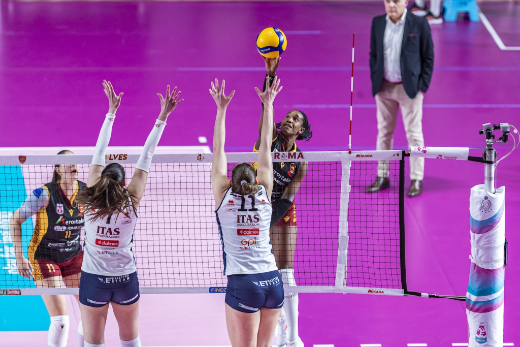 Tra le capitoline c’è Schwan al posto di Melli, Rivero con il servizio annulla il tentativo di allungo trentino (da 2-4 a 7-7) ma la fuga è solamente rimandata: grazie ad un’attenta correlazione muro-difesa che riesce finalmente ad arginare Bici, l’Itas si spinge sul 16-19 con Shcherban e Olivotto a segno a muro e Michieletto in evidenza da posto 4. Gli errori di Rucli e Bici spianano la strada al sestetto di Mazzanti (18-22), che chiude la quarta frazione con DeHoog (20-25).