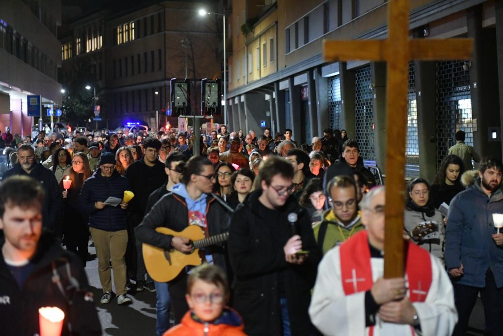 Le terribili notizie dei morti e dei feriti nell’attentato a Mosca hanno raggiunto ieri anche i tanti giovani che hanno pregato in cammino per la tradizionale Via Crucis cittadina promossa dalla Pastorale Giovanile. A portare la croce dalla chiesa del Santissimo al Duomo l’ arcivescovo Lauro che ha citato proprio l’evento di Mosca per richiamare il doloroso conteso mondiale di guerre e violenza. Tisi ha invitato i presenti a puntare lo sguardo sul modo di morire di Gesù in croce, abbracciando i suoi nemici e chiedendo addirittura al Padre il perdono per loro: “una lezione di straordinaria vita donata e, proprio per questo, vita autentica. Fertile seme di pace”.