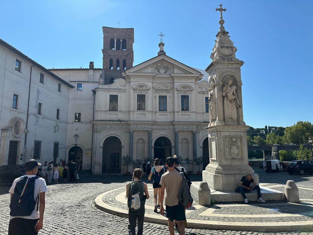 I giovani poi sono stati introdotti alla Comunità di Sant’Egidio ascoltando la voce del vicerettore della Basilica e di Irene, una giovane di 23 anni che svolge numerose attività all’interno della comunità. Il vicerettore ha spiegato loro come la chiesa fosse stata voluta dall’imperatore Ottone III nel 998 come cappellina personale. Già luogo di culto e pellegrinaggio, lì si venerava il Dio della Guarigione. I fedeli erano soliti prendere l’acqua dal pozzo situato in mezzo alla chiesa, acqua che si riteneva avesse poteri curativi. Dopo la conversione, si decise di dedicare la chiesa all’apostolo amico di Gesù, San Bartolomeo, le cui spoglie mortali giacciono oggi all’interno dell’altare della Chiesa.