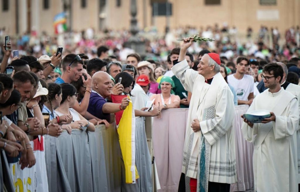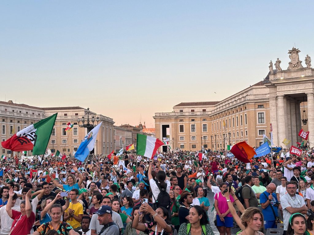 Arrivati in piazza, si è respirato sin da subito quel clima da Giornata Mondiale della Gioventù, con bandiere da ogni provenienza, canti, balli e volti che incrociando lo sguardo generavano ogni momento il Paradiso. La festa si è svolta con l’alternarsi di momenti musicali a momenti di ascolto della Parola, fino al rinnovo della Confessio Fidei condotto dal Cardinal Matteo Maria Zuppi: “Disarmiamo i nostri cuori – ha detto – per disarmare cuori e mani di un mondo violento, per guarirne le cicatrici, per impedire nuovi conflitti”.