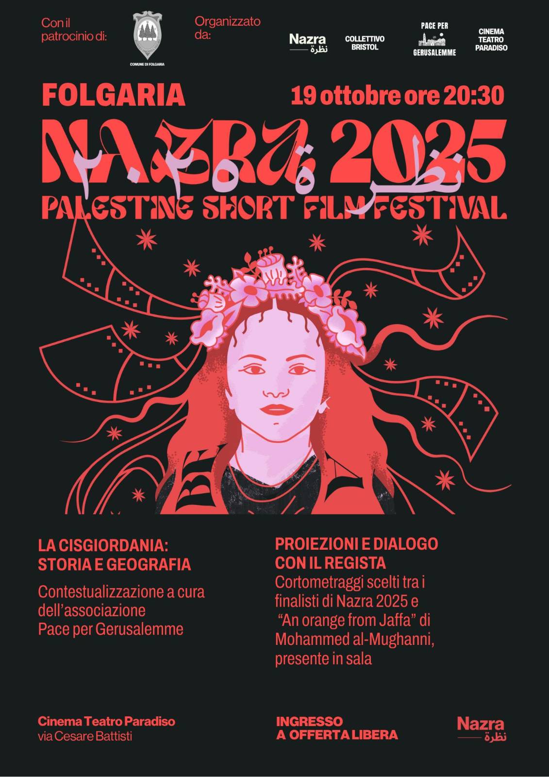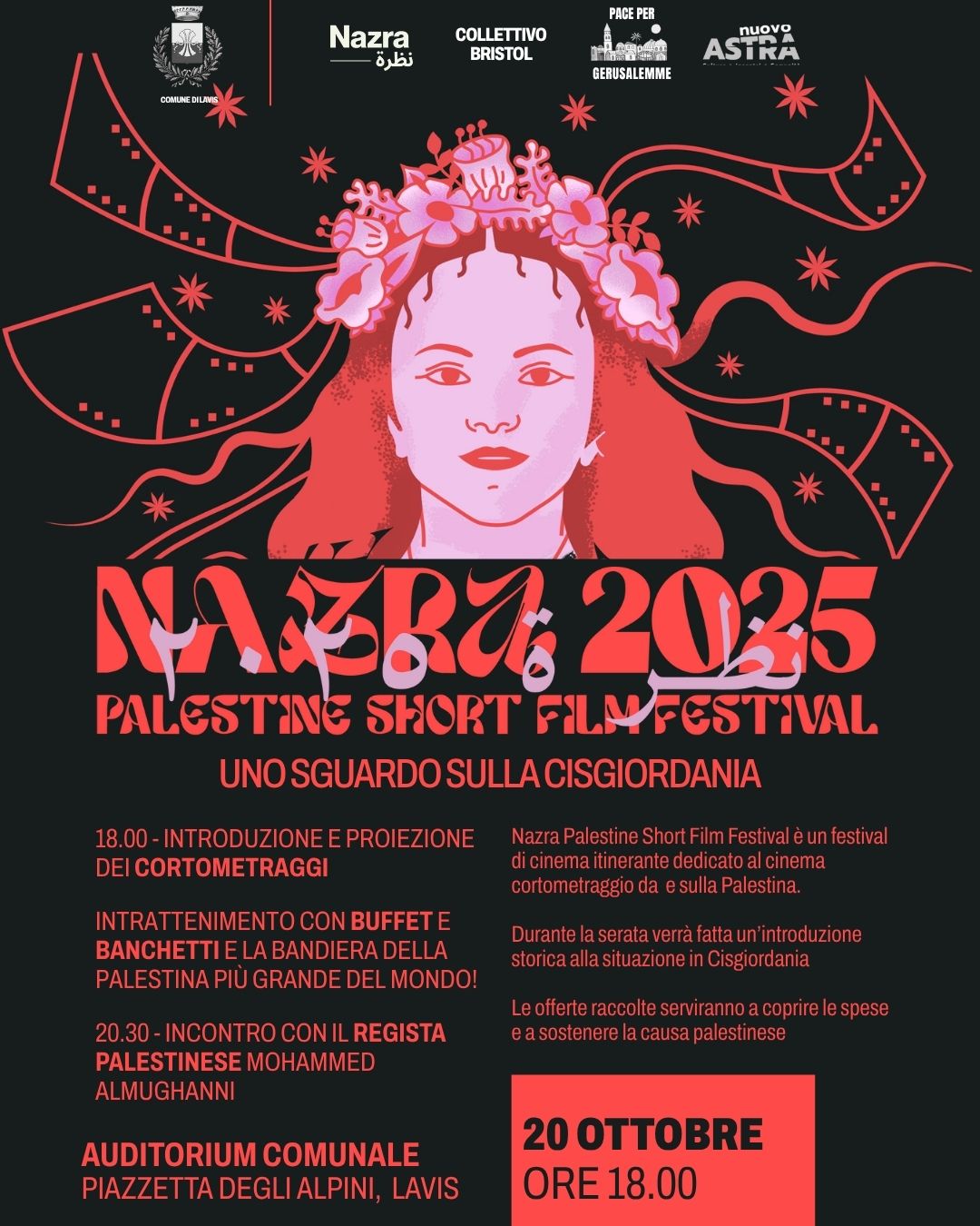 Il collettivo Bristol, in collaborazione con l’associazione Pace Per Gerusalemme e con il supporto e patrocinio dei Comuni di Folgaria e Lavis, in solidarietà con il popolo palestinese, organizza una tappa trentina del festival di cinema palestinese Nazra. Si tratta di un festival itinerante con tappe in molte città italiane di cortometraggi da e sulla Palestina che negli anni (dal 2017) ha intessuto una rete di contatti solidali di supporto nella promozione delle voci e degli sguardi dei cineasti palestinesi contemporanei.