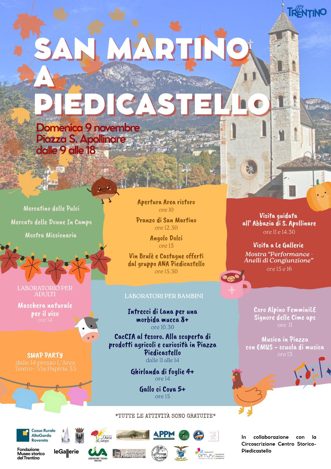 Si svolgerà domenica 9 novembre, dalle 9 alle 18, in piazza Sant’Apollinare, la festa “San Martino a Piedicastello”, in collaborazione con la Circoscrizionale Centro storico – Piedicastello. Tutte le attività sono gratuite. Tra queste, il mercatino delle pulci, il mercato delle donne in campo, la mostra missionaria, le visite guidate all’abbazia e alle Gallerie.