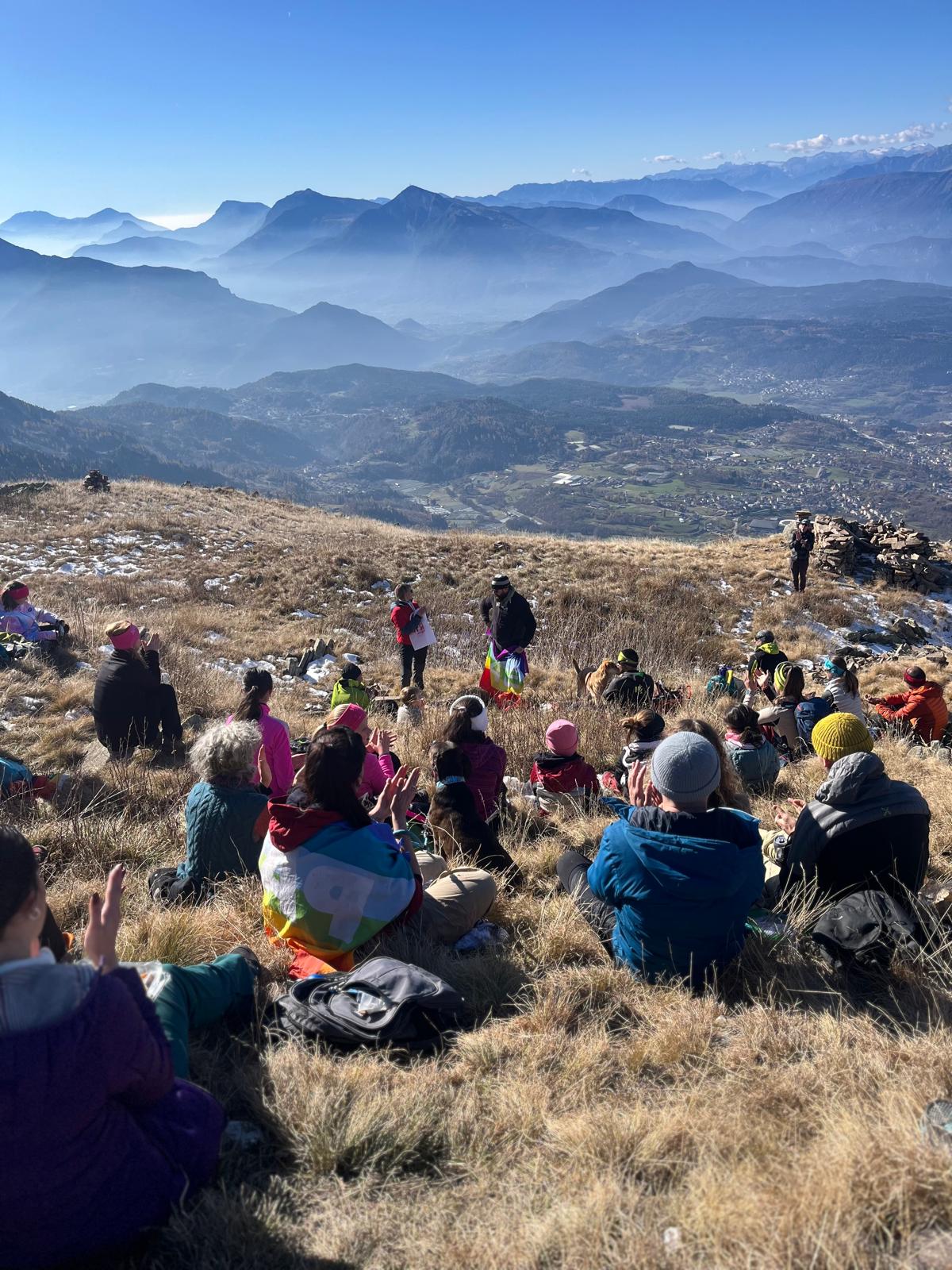 Dopo il pranzo si è colta l’occasione per un momento di riflessione. Luca Moschen ha parlato dell’importanza della partecipazione quale strumento per tutelare la democrazia e per ricordare l’importanza del vigilare su quello che sta accadendo a Gaza ma anche in Ucraina e nel resto del mondo. Catia Mattivi, volontaria di Emergency, ha spiegato ai presenti il significato della campagna R1PUD1A, e a seguire alcune giovani della SAT hanno parlato della Costituzione. Un momento significativo si è tenuto a conclusione, con l’apposizione della bandiera della pace sulla croce della Cima di Costalta e con una foto di gruppo.
