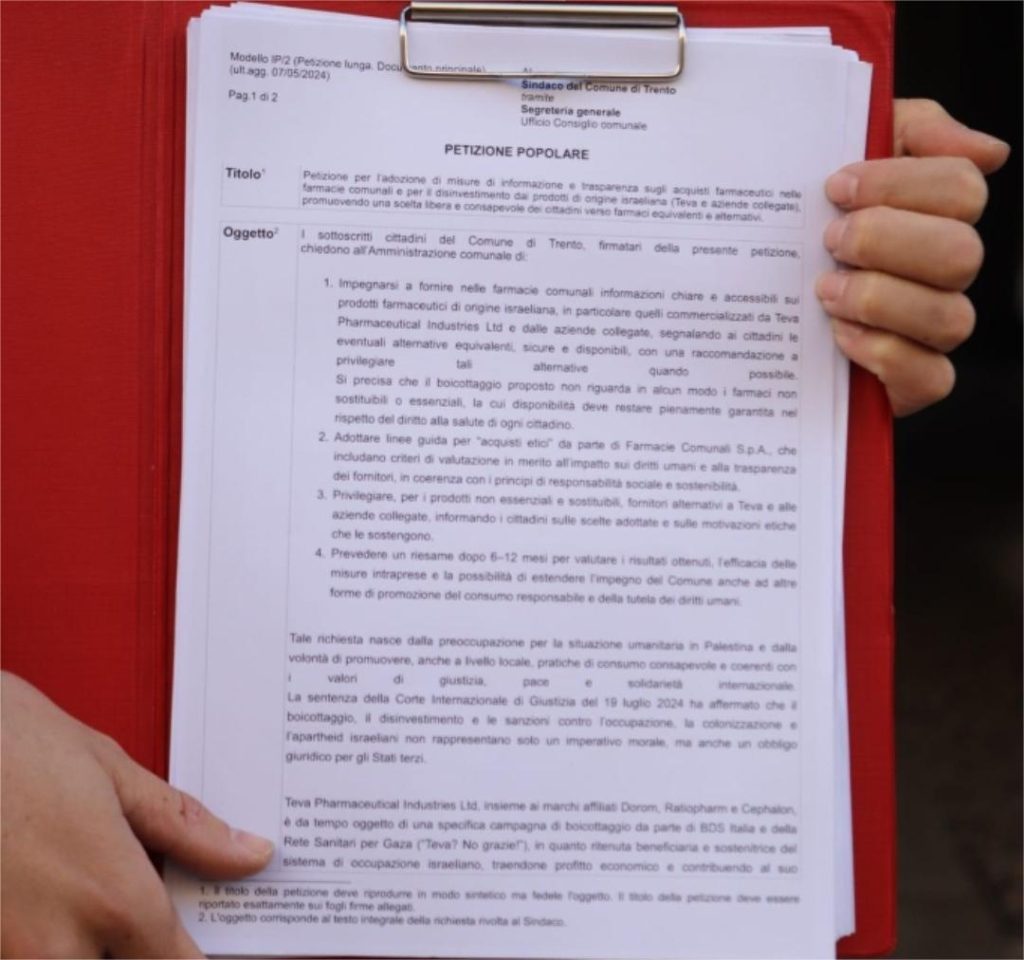 È stata consegnata dal medico e infettivologo dell’ospedale Santa Chiara di Trento Alessandro Castelli alla segreteria del Comune di Trento la petizione che chiede una maggiore trasparenza e responsabilità negli acquisti delle farmacie comunali, promossa a Trento dalla Rete dei Sanitari per Gaza. La raccolta delle firme era iniziata giovedì 13 novembre a Povo durante un partecipatissimo incontro dal titolo “Palestina: uno sguardo storico sul genocidio”.