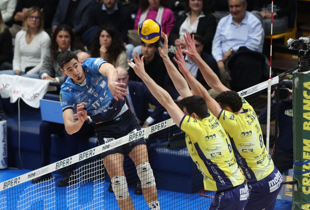 Arriva la seconda battuta d’arresto consecutiva per l’Itas Trentino nel 91° derby dell’A22: i gialloblù escono sconfitti per 1-3 dal PalaPanini di Modena nel turno infrasettimanale (il sedicesimo assoluto) di SuperLega sul campo della quarta forza del campionato, che ora si fa più vicina in classifica. Il servizio dei padroni di casa, il più efficace di tutta la categoria, ha fatto a lungo la differenza, spingendo la Valsa Group subito avanti 1-0 e poi decidendo la seconda metà del match, comunque equilibrata, come raccontano bene i 14 ace realizzati (6 solo dell’opposto Buchegger, il più prolifico del torneo in questo fondamentale) in quattro set. Dopo aver sbandato nel parziale di apertura, Trento ha iniziato a giocare, lavorando meglio degli avversari a muro ed in difesa ma alla fine cedendo l’intera posta in palio, con gli emiliani più efficaci e risoluti a rete grazie anche alla bella serata in attacco di Porro (mvp con 15 punti, il 52% e tre battute punto) e l’ingresso azzeccato di Bento (10 col 71%), che ha tolto le castagne dal fuoco sia nel terzo sia nel quarto set. Per l’Itas Trentino, ancora terza con due punti di vantaggio sulla stessa Modena e tre di ritardo da Verona, in doppia cifra il muro (a segno 10 volte, tre a testa per Sbertoli, Bartha e Flavio) e l’intero trio di palla alta, con Faure best scorer grazie a 17 punti col 60% in attacco e due ace personali.