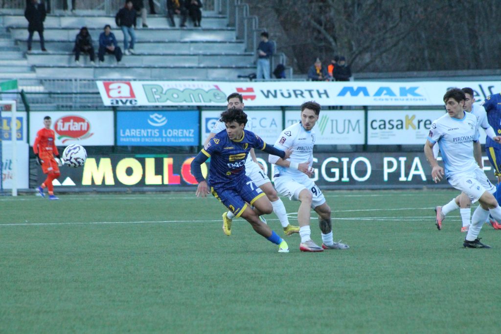 La cronaca. Mister Luca Tabbiani conferma il 4-3-3 con Barlocco tra i pali e la linea difensiva composta da Fiamozzi, Corradi, Trainotti e Maffei. In mediana agiscono Benedetti e Aucelli ai lati di Fossati, mentre in avanti spazio a Capone e Chinetti sugli esterni con Pellegrini riferimento centrale. La gara si apre subito con il Trento che impone il proprio ritmo. Dopo appena venti secondi Benedetti arriva alla conclusione, con il pallone che termina sul fondo. I gialloblù continuano a spingere e pochi minuti più tardi vanno ancora vicini al vantaggio con la deviazione di Pellegrini, salvata in extremis dalla retroguardia ospite. La formazione di Tabbiani mantiene il controllo del gioco per tutta la prima frazione e nel finale sfiora il gol con Fossati, ben imbeccato da Pellegrini, che colpisce la traversa.