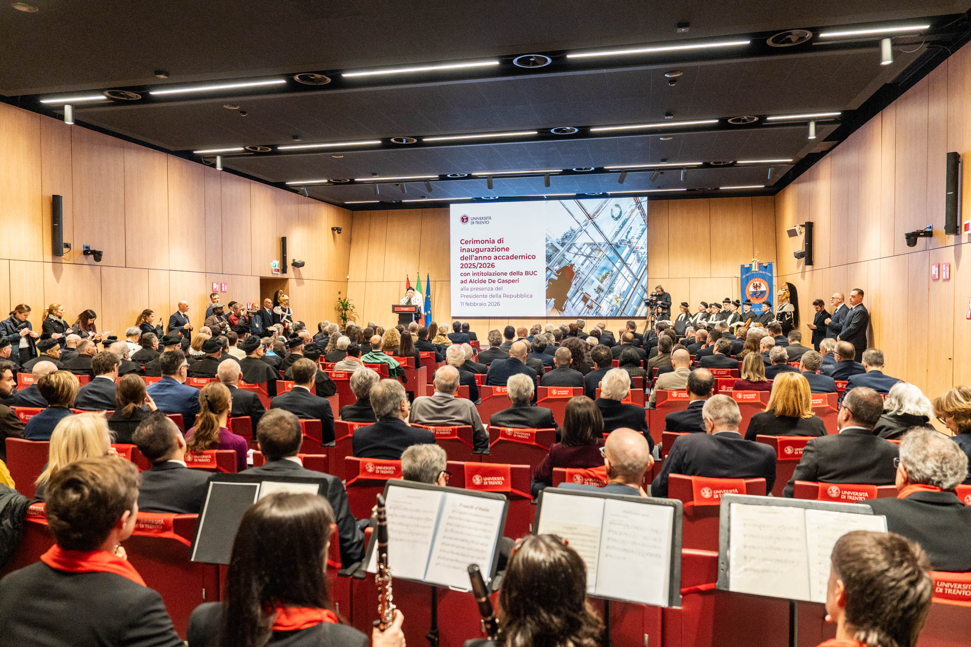Parla il linguaggio della pace e dei valori dell’Europa unita la cerimonia di inaugurazione dell’anno accademico 2025/26, che si è tenuta oggi, assieme all’intitolazione della Biblioteca universitaria centrale ad Alcide De Gasperi, alla presenza del Presidente della Repubblica Sergio Mattarella. Cuore dell’intera giornata è stato l’omaggio dell’Università di Trento allo statista fautore dell’autonomia trentina, che fu tra i padri fondatori dell’Unione europea. La sua figura è stata celebrata nelle parole di dedica del rettore dell’Ateneo Flavio Deflorian, pronunciate svelando una targa alla Buc e, all’Itas Forum, con la prolusione di Giuseppe Tognon, emerito di Storia dell’educazione dell’Università Lumsa di Roma, incentrata sullo “spirito costituente” degasperiano.