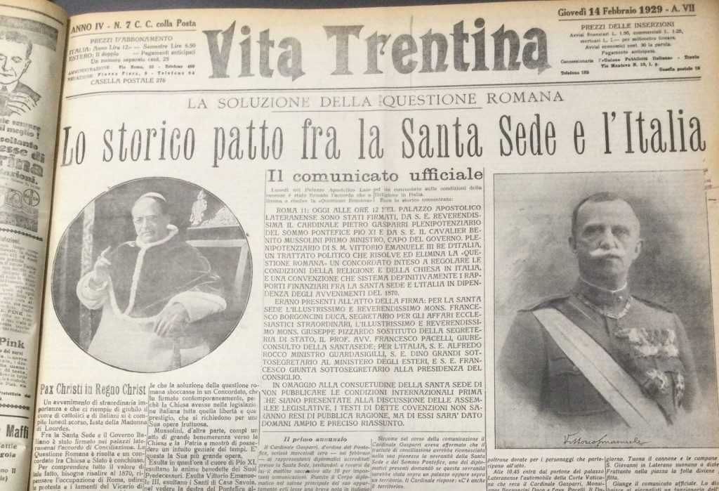 Vita Trentina diede con grande risalto la notizia della firma dei Patti Lateranensi fra Benito Mussolini (allora “solo” Capo del Governo del Regno d’Italia, plenipotenziario di Vittorio Emanuele III) e il card. Gasparri, segretario di Stato, plenipotenziario di Pio XI. “Storico patto” lo definì nel titolo a tutta pagina, “accordo di conciliazione” lo definisce poi l’articolo che fa risalire all’estate 1926 i primi contatti ufficiosi fra personalità e giuristi dello Stato (l’avvocato Barone) e della Santa Sede (l’avvocato Francesco Pacelli) per chiudere positivamente la “Questione romana”, apertasi nel 1870 con la presa di Porta Pia da parte dei bersaglieri, e la conseguente fine dello Stato Pontificio con la proclamazione di Roma capitale.