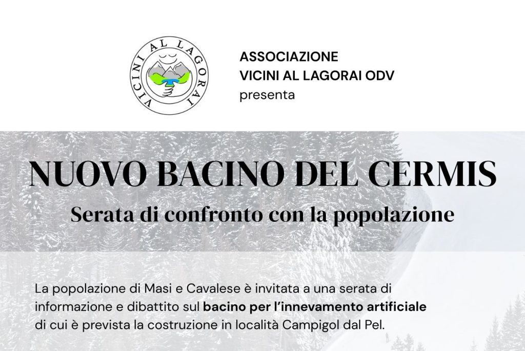 L’evento sarà la prima, e al momento unica, occasione per conoscere da vicino il progetto del nuovo bacino per l’innevamento artificiale, che la Società Funivie Alpe Cermis SPA intende realizzare sul Cermis la prossima estate in località Campigol dal Pel. “Ideato attraverso ben tre legislature, il progetto non ha mai avuto una presentazione dedicata a chi vivrà sotto al bacino. Per questo abbiamo richiesto a più riprese che venisse organizzata una serata per gli abitanti di Masi e Cavalese”, spiegano gli organizzatori.