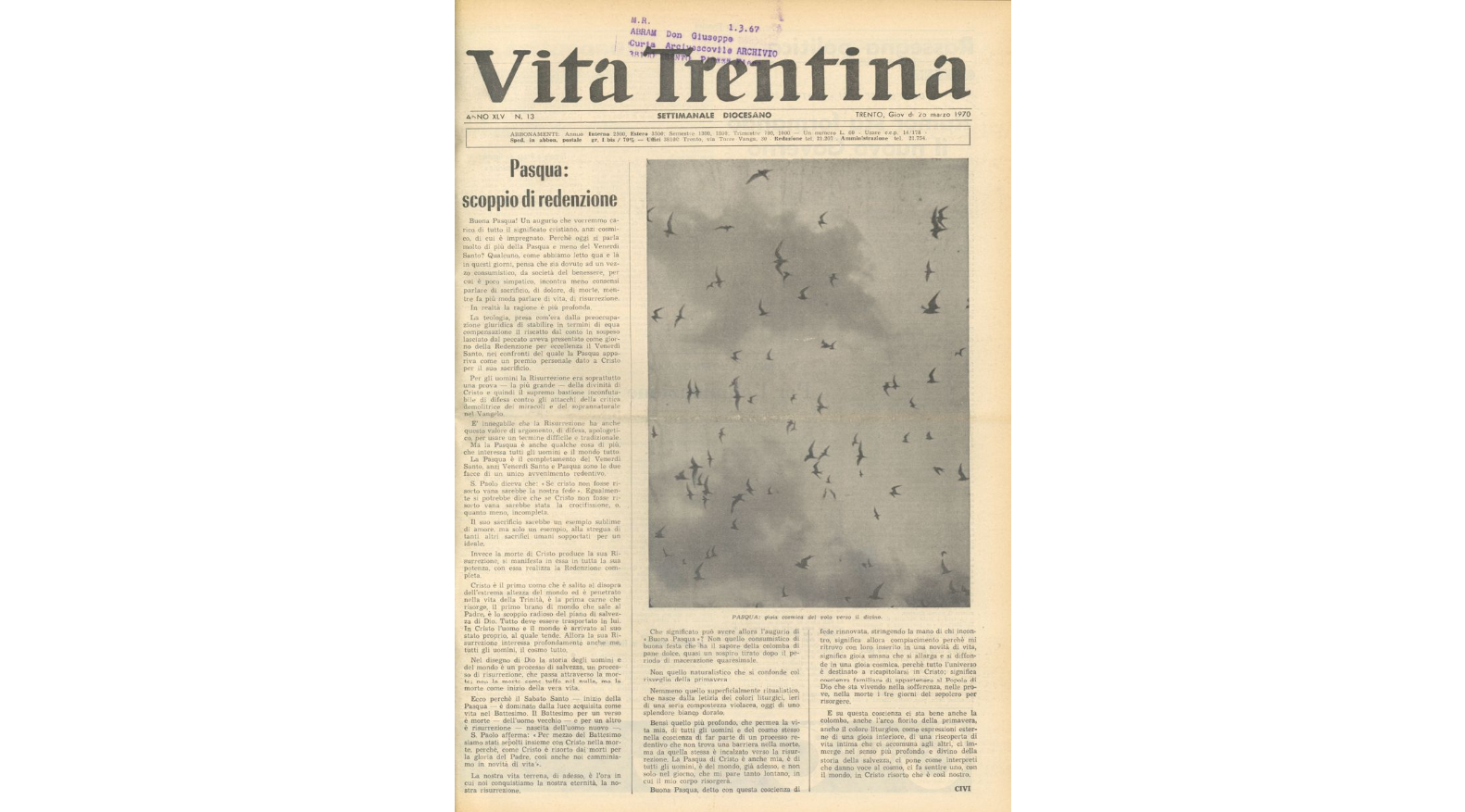 Per cento volte (o poco meno) in un secolo l’annuncio pasquale è risuonato forte anche sulle prime pagine del nostro settimanale: “È risorto!”, la notizia delle notizie, è apparsa fin dai primi anni come titolo da commentare nella copertina del numero pasquale ed il cantiere di ricerca storica che abbiamo aperto in questo centenario ci porta a rivedere come di anno in anno la redazione di Vita Trentina ha preparato e commentato la Resurrezione di Cristo, “senza la quale vana sarebbe la nostra fede”: riflessioni teologiche e bibliche, ma anche rinascite morali e sociali, storie di vita e capolavori dell’arte cristiana in un’attenzione speciale, come se fosse davvero l’edizione più importante dell’anno per i lettori cattolici.