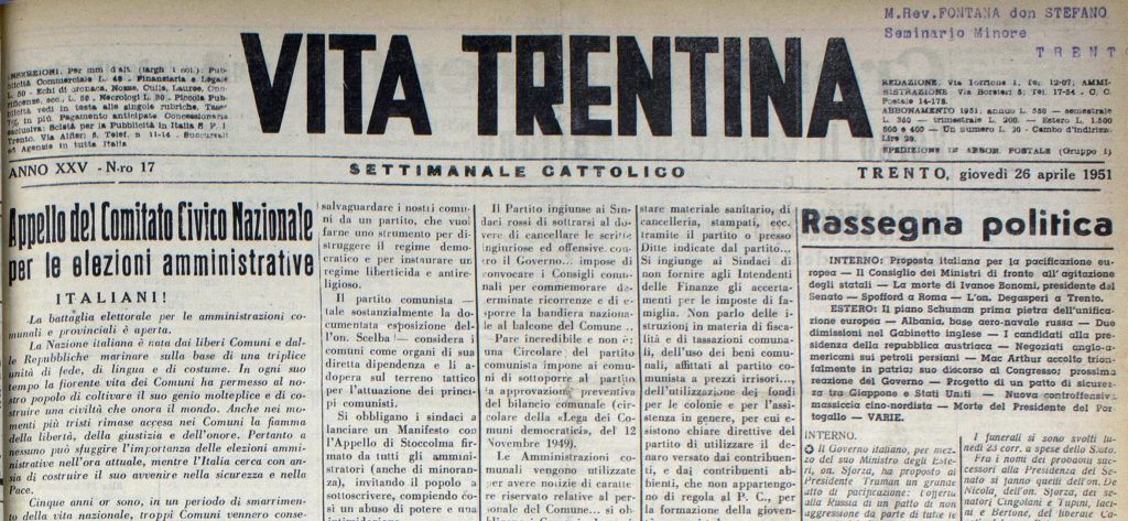 Il settimanale “Vita Trentina” diede notizia della nascita della Ceca, la Comunità economica del Carbone e dell’Acciaio, in maniera tempestiva nel suo numero del 26 aprile 1951, a pochi giorni dalla firma del Trattato di Parigi del 18 aprile che la istituiva, cogliendone subito la portata storica, che andava ben al di là di quella relativa ad un accordo commerciale.