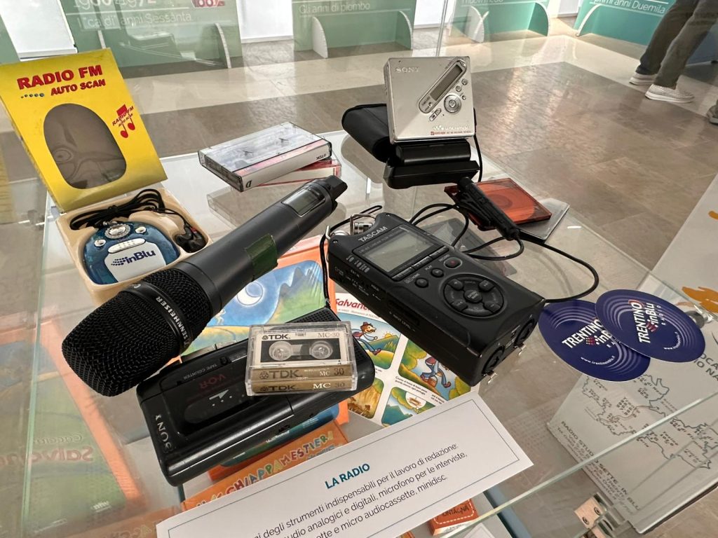 In vetrina registratori audio analogici e digitali, microfono per le interviste, audiocassette e micro audiocassette, testimoniano il passaggio dall’analogico al digitale, di cui un esempio è il lettore e riproduttore MiniDisc.