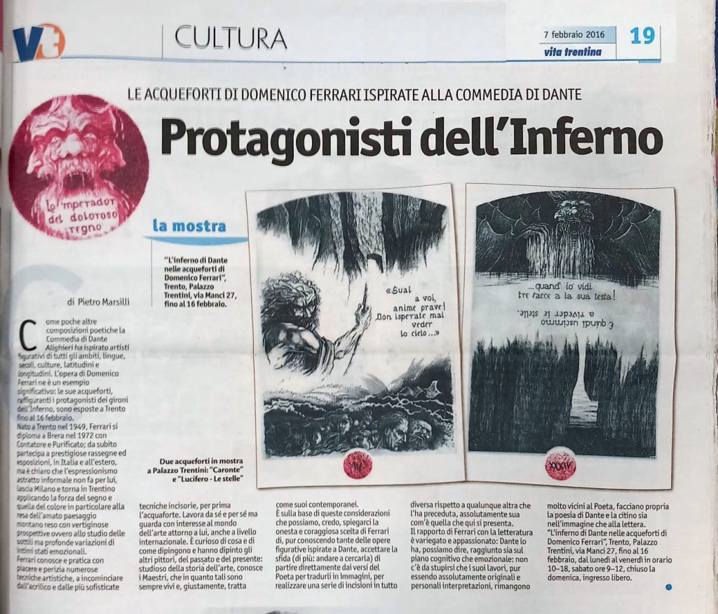 È questa la ragione per cui anche questo centenario iconografico serve a ricordare l’impegno di un altro artista trentino, contemporaneo in questo caso: Domenico Ferrari. All’inferno di Dante, tema nei secoli dei più illustri incisori (dai codici miniati presso la British Library di Londra alle edizioni venete commentate dal Landini e dal Tommaseo, fino alle incisioni francesi di Gustav Doré) Ferrari ha dedicato tavole che hanno avuto una risonanza nazionale, esposte a Roma, a Palazzo Madama, sede del Senato, visitate dal presidente della Repubblica Sergio Mattarella accompagnato dal cardinale Ravasi e dall’allora presidente del Senato Grasso. La mostra fu esposta l’anno successivo a Trento (Palazzo Trentini) e poi in altre città italiane, ma il suo richiamo perdura ancora oggi per l’imprinting che il Viaggio – elemento così importante nella cultura dell’antichità e, come visto, nell’arte e nella pittura di Domenico Ferrari – rappresenta anche nella modernità, sotto molteplici aspetti.