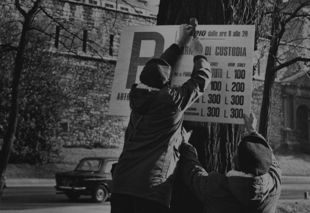 Correva l’anno 1976. In piazza della Mostra, Gino Lorandi da Cimone (ugola d’oro del bel canto; suo l’inno “Forza Francesco” dedicato al ciclista Moser) e il suo collega Lino Maltratti appendono un cartello all’albero. Annuncia le tariffe del parcheggio custodito ricavato nella piazza. Gratuito, la prima ora, per i soci dell’ACI. In Trentino circolava già la vettura con targa numero 225.000, ma le auto in circolazione con la targa “TN” erano 135 mila.