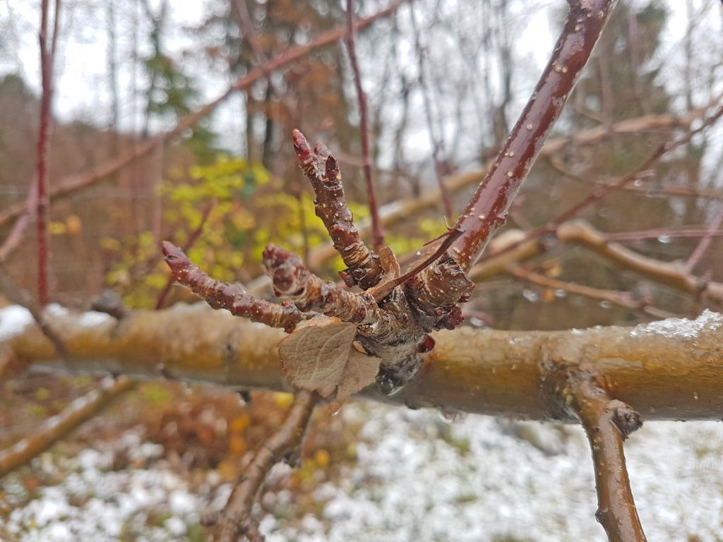 A novembre cadono le foglie e progressivamente la linfa fa ritorno alle radici. Le gemme entrano in una fase di parziale disidratazione, indurimento e modifica chimica dei tessuti permettendo maggior resistenza al gelo. Torniamo così ai primi giorni di dicembre… le gemme sono in quiescenza. Se noi tagliamo un rametto di quel melo e lo mettiamo in un bicchiere d’acqua al caldo, le gemme non germoglieranno. La dormienza sarà interrotta solo quando la pianta avrà potuto superare un sufficiente periodo di freddo (temperature inferiori a 7°C), probabilmente febbraio/marzo e sarà “risveglio vegetativo”!