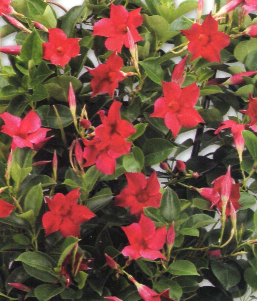 ESUBERANTE DIPLADENIA. La Dipladenia (Mandevillea suaveolens) è un grande rampicante da esterno per climi miti. Quella coltivata in vaso da noi è la Dipladenia splendens, anch’essa rampicante. E’ tipica pianta da interni o meglio da veranda, anche se d’estate può stare bene all’esterno. Ama posizioni molto luminose e terriccio fatto di torba nera. Resiste bene fino a 10°C e soffre sopra i 28°C. Ha bisogno di acqua fornita con moderazione: bagnare ogni 10 giorni in inverno e ogni 3 giorni in estate. Concimare per tutto il periodo della fioritura che è sempre molto abbondate e continua. la Dipladenia è specie ancora poco diffusa, ma non passa inosservata grazie ai suoi grandi fiori dai colori molto vivaci (il rosso predomina) che abbelliscono il terrazzo o la veranda per almeno due mesi. Se in posizione ottimale cresce vigorosa e allunga i suoi getti coprendo presto ampie superfici verticali (nel caso aiutarla con graticci, fili di ferro, ecc.).