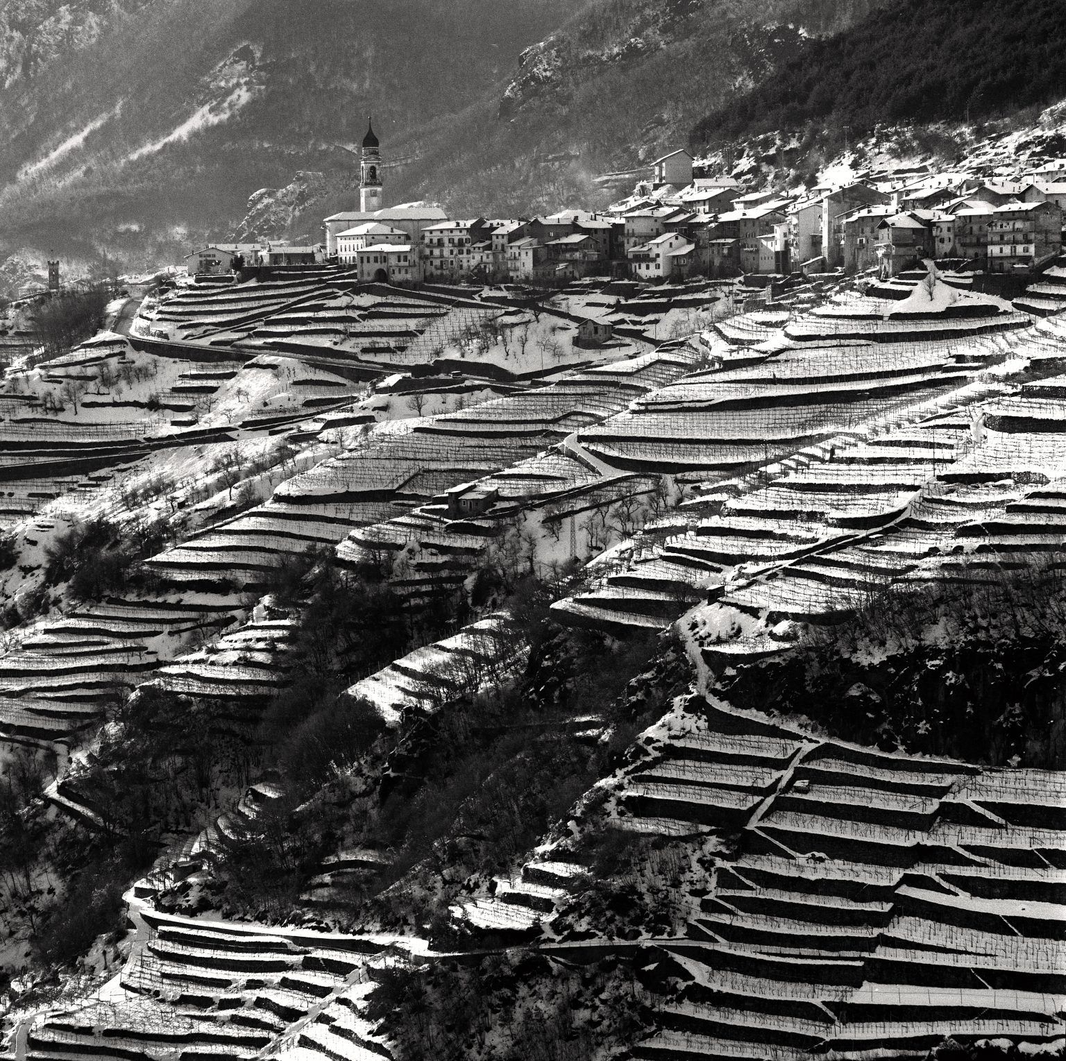 I terrazzamenti sostenuti da secolari muri a secco hanno consentito alla Val di Cembra di entrare a pieno diritto nei “Paesaggi rurali storici d’Italia”. Come un dipinto in bianco e nero, la fotografia (1985) esalta il panneggio dei campi che, come un mantello punteggiato dalla neve, disegnano le vallette sotto Faver.