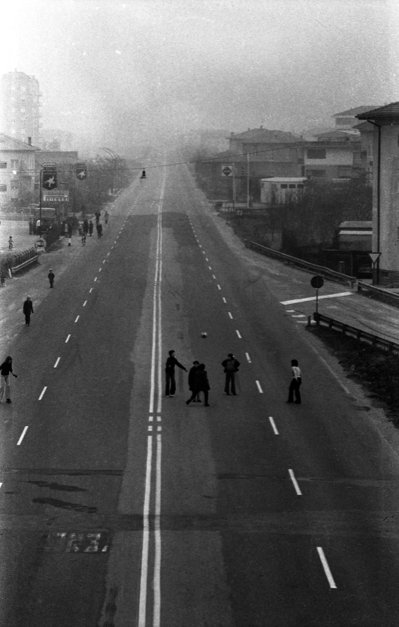 Quell’inverno, i termosifoni furono tenuti al minimo e la domenica le città restarono deserte. Le strade, anche le principali (nella foto: Via Brennero a Trento) furono utilizzate dai ragazzi come piste ciclabili, campi da calcio o per pattinaggio a rotelle. La pacchia, per loro, durò poco.