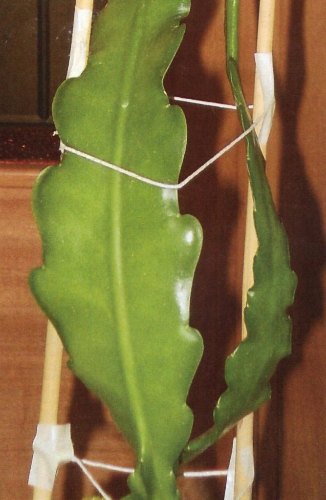 Si tratta della lingua di suocera (Epiphyllum achermanni). I fusti sono succulenti, appiattiti e allungati, di colore verde intenso e incapaci di sostenersi da soli, con margini dentellati o ondulati e ornati da sottili spine (foglie trasformate). I fiori sbocciano tra aprile e agosto lungo i margini. Sono grandi ed hanno forma ad imbuto, sono di colore rosso, bianco o giallo, ma anche variegati. Hanno la caratteristica di durare un giorno solo e di emanare uno sgradevole odore che ha la funzione di attirare specifici insetti impollinatori.
