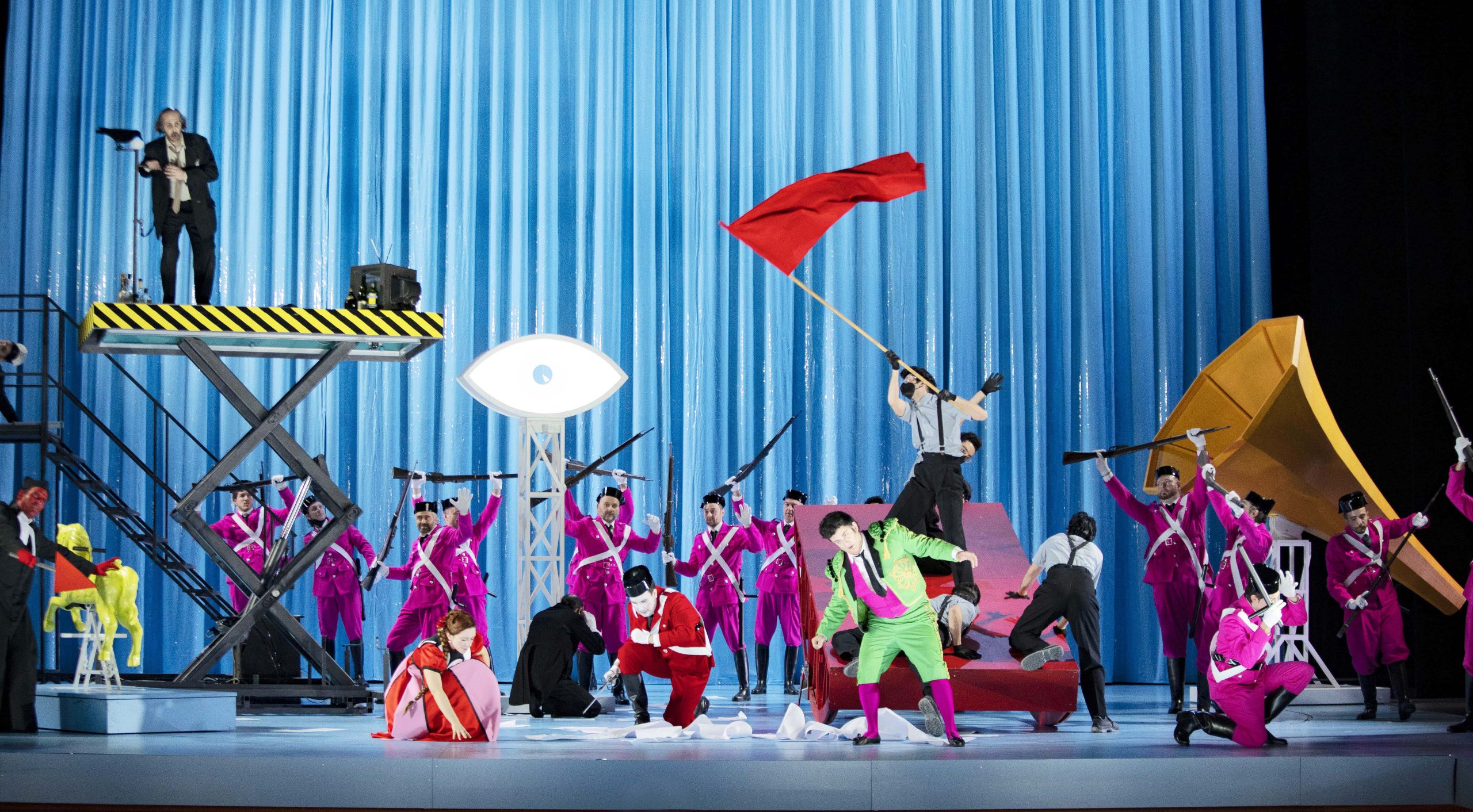 “Mi sono immaginato lo spettacolo come un grande ingranaggio ad orologeria, uno spazio vuoto che di scena in scena si riempie di immagini ed elementi che niente hanno a che fare con la Spagna della tradizione; unica concessione un Figaro torero e scatenato”, dice il regista Fabio Cherstich. “E poi, come per dar corpo all’irresistibile ‘follia’ della musica, nonché al puro godimento che può derivarne sganciandola da ogni realismo, proporzioni ribaltate nella scena dove tutto scorre su binari, o sale e scende all’improvviso“.